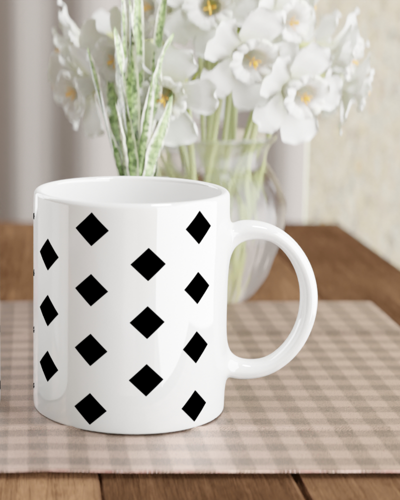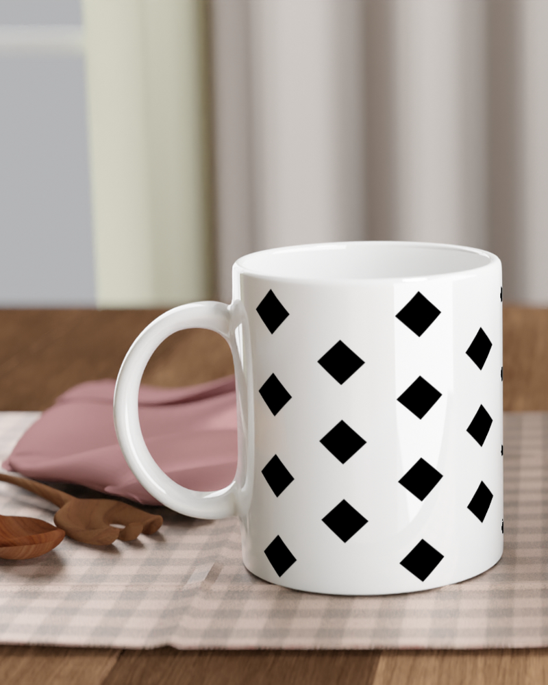 This beautiful ceramic mug is perfect for any event of the day. Your morning coffee, a hot chocolate, or any other hot beverage you enjoy. The mug is glossy white with a colored rim, inside, and handle. The prints come out beautifully and vividly on it. The print retains its quality and luster when used in both microwaves and the dishwasher.